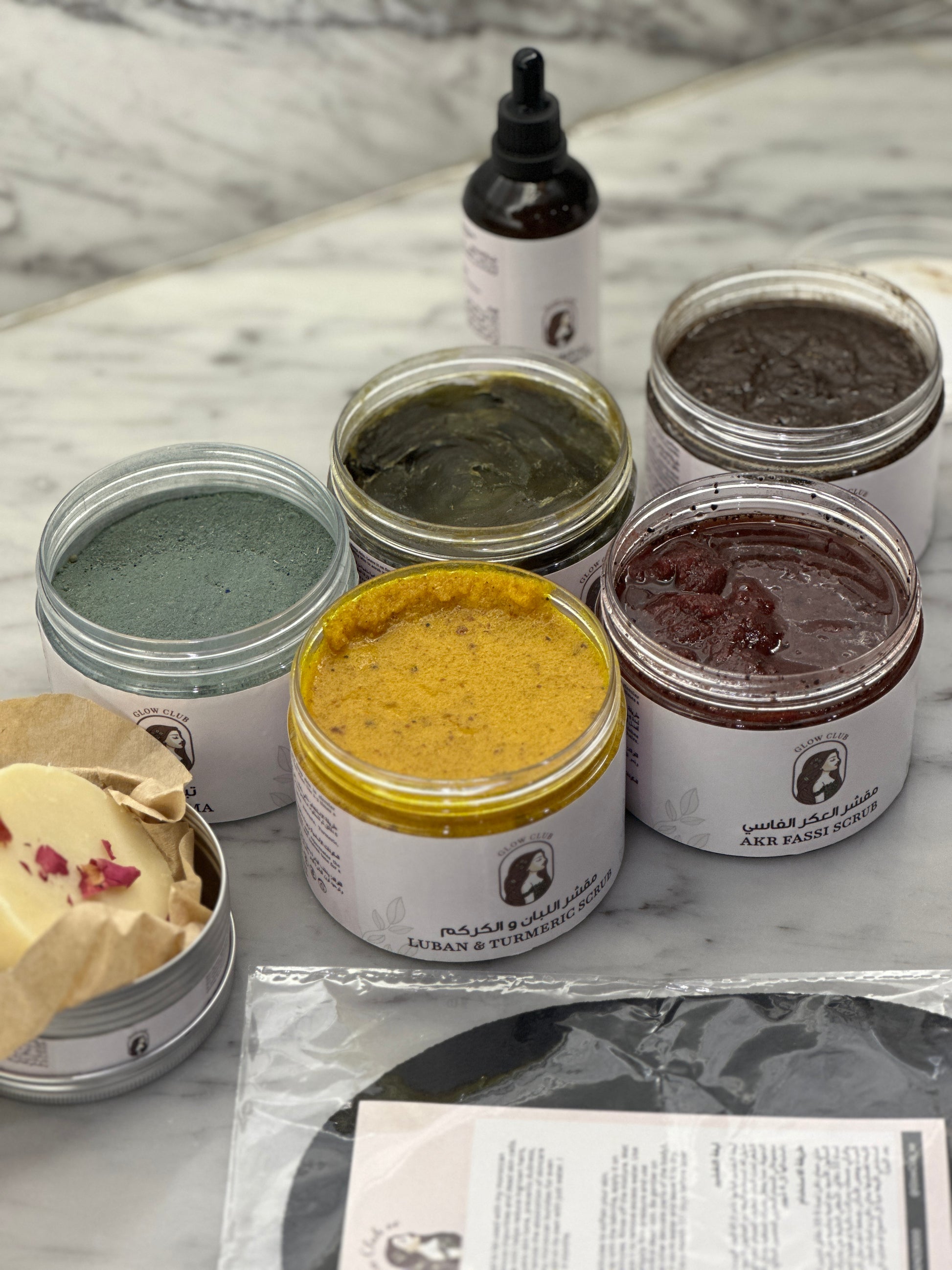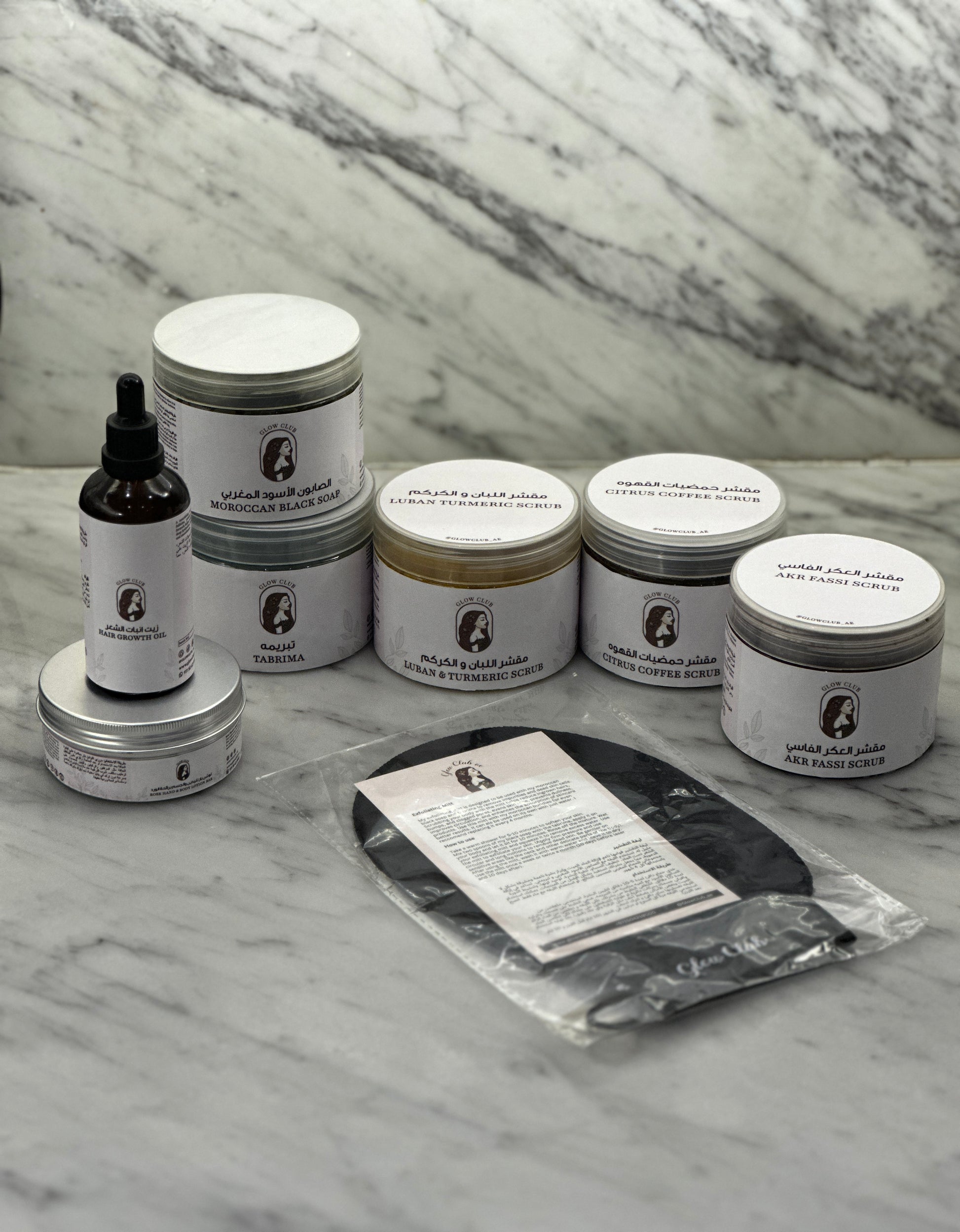 Rose Hand and Body Lotion bar, Hair growth oil, Tabrima & Moroccan Black Soap, Luban & Turmeric Scrub, Citrus Coffee Scrub, Akr fassi Scrub, Exfoliating Mitt